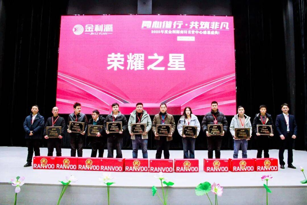 南浔直营中心运营总监主持颁奖环节,为27位优秀合作伙伴分别颁发启明星奖、荣耀之星、金尊奖三大奖项。颁奖环节的深层意义远超表彰本身:其一,是对优秀合作伙伴三年来辛勤付出与坚定信任的认可与回馈,彰显金利源“共生共赢”的合作理念;其二,通过榜样的力量激励全体合作伙伴,凝聚“比学赶超”的发展氛围,推动整个合作生态共同进步;其三,以奖项为纽带,进一步夯实品牌与合作伙伴的情感联结,强化长期合作的信心与决心,为未来携手抢占绿色建材市场先机筑牢根基。
